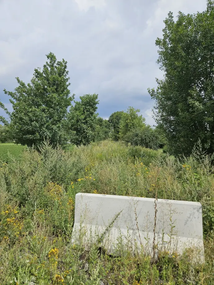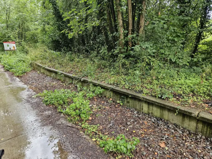 Hier tussen de bomen, achter het betonnen muurtje liep de L86, enkel de ballast tussen het onkruid is nog zichtbaar, de sporen zijn er helaas uitgebroken (ter voorbereiding aanleg fietspad?)